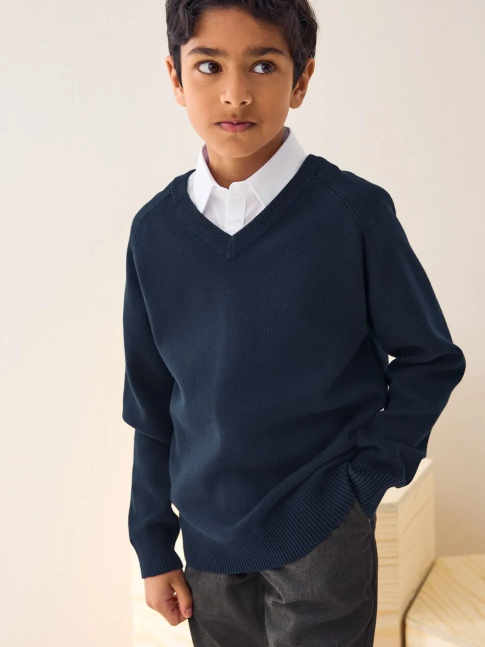 Bleu marine – Pull scolaire tricoté à col en V (3-16ans)