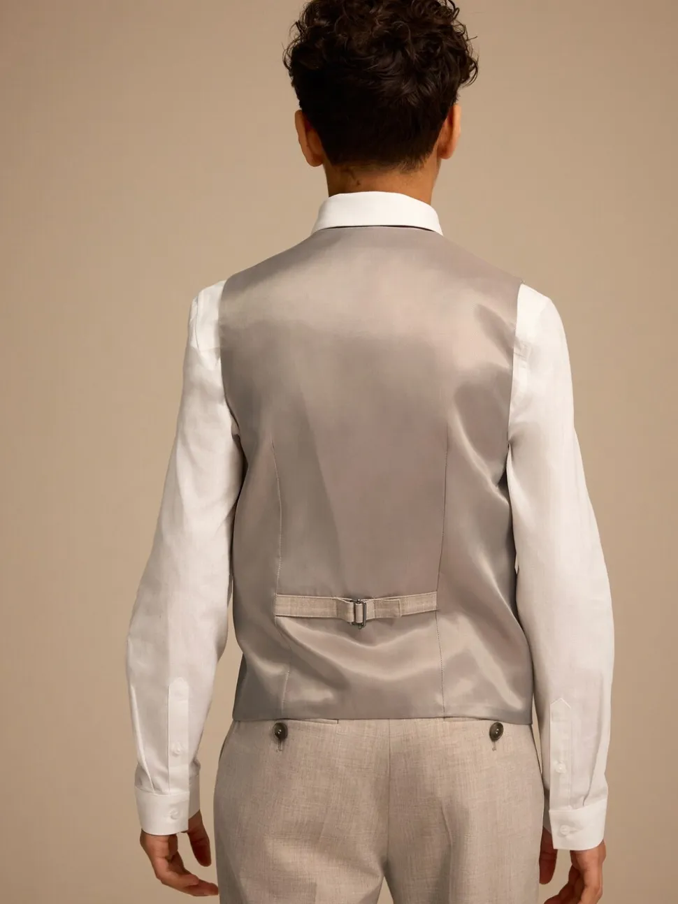 Gilet Corps 62% polyester, 33% viscose, 5% élasthanne. Doublure : 100% polyester. Panneau arrière : 54% polyester, 46% viscose. Chemise : 70% coton, 30% lin. Cravate 100% polyester.
