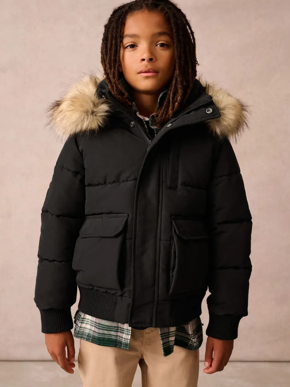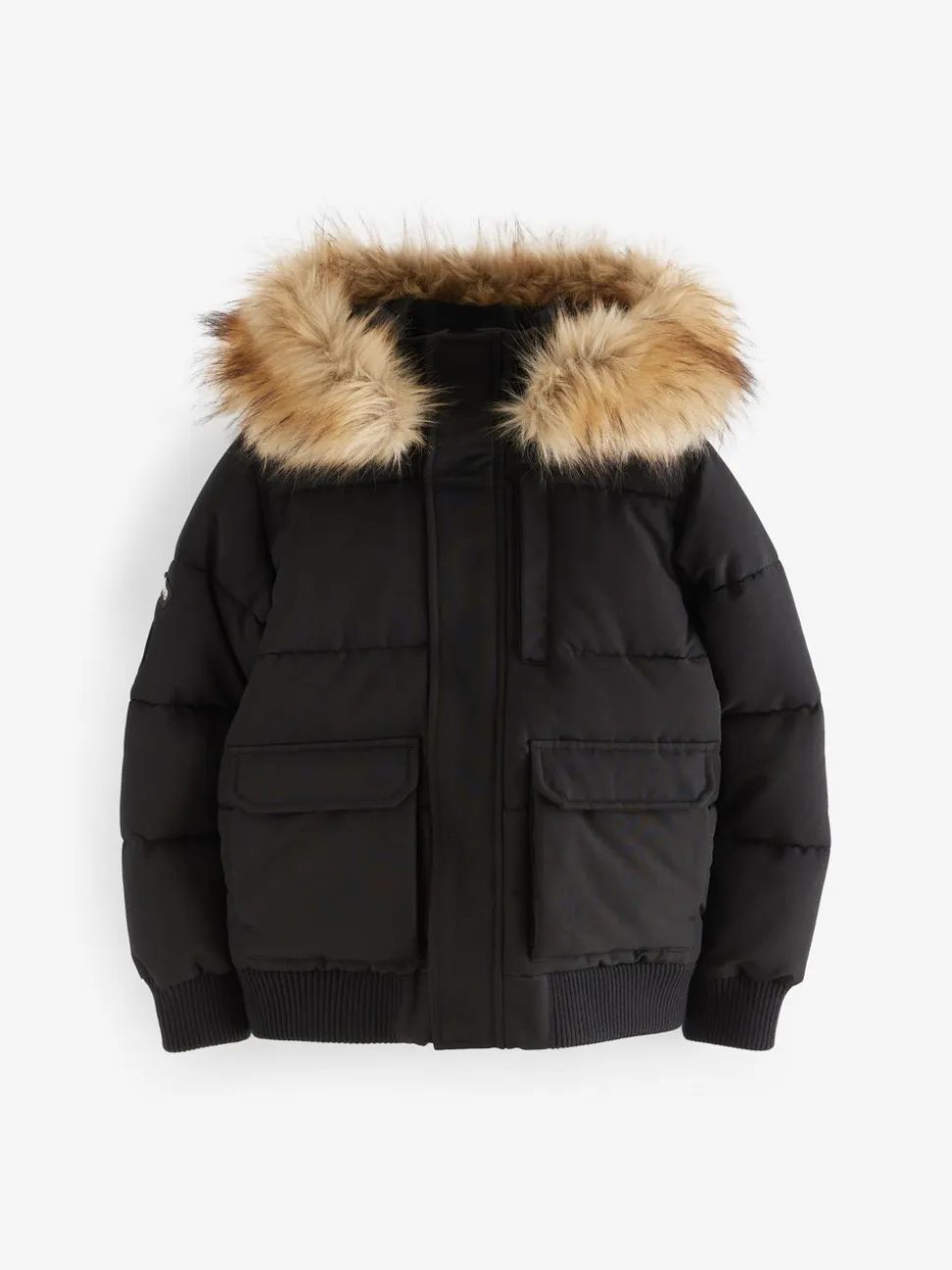 Lavable en machine. Extérieur 100% polyester. Doublure du corps 100% nylon. Doublure de la capuche 100% de polyester. Fourrure artificielle 48% Modacrylique, 43% acrylique, 9% polyester. Côtes 98% polyester, 2% élasthanne. Garnissage 100% polyester.