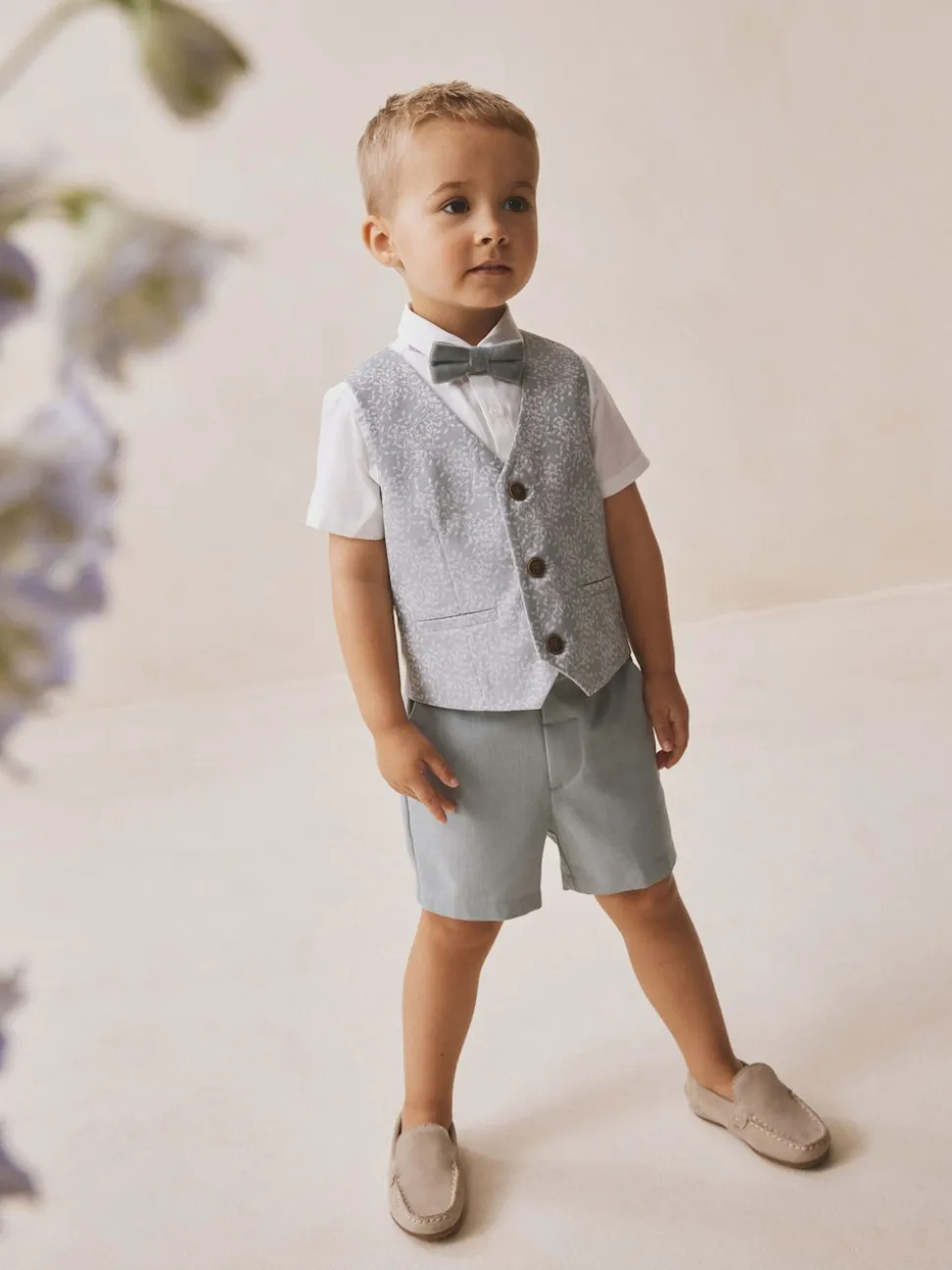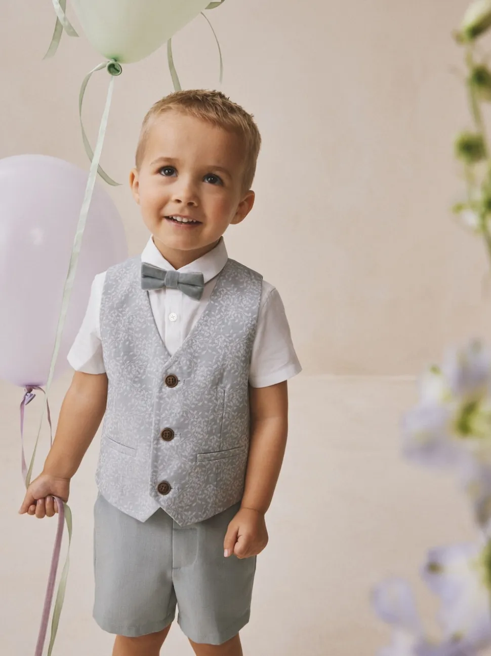 Waistcoat Main 83% Polyester, 17% Viscose. Lining 100% Polyester. Shirt 100% Cotton. Shorts 69% Polyester, 25% Viscose, 6% Elastane. Bow Tie 100% Polyester.