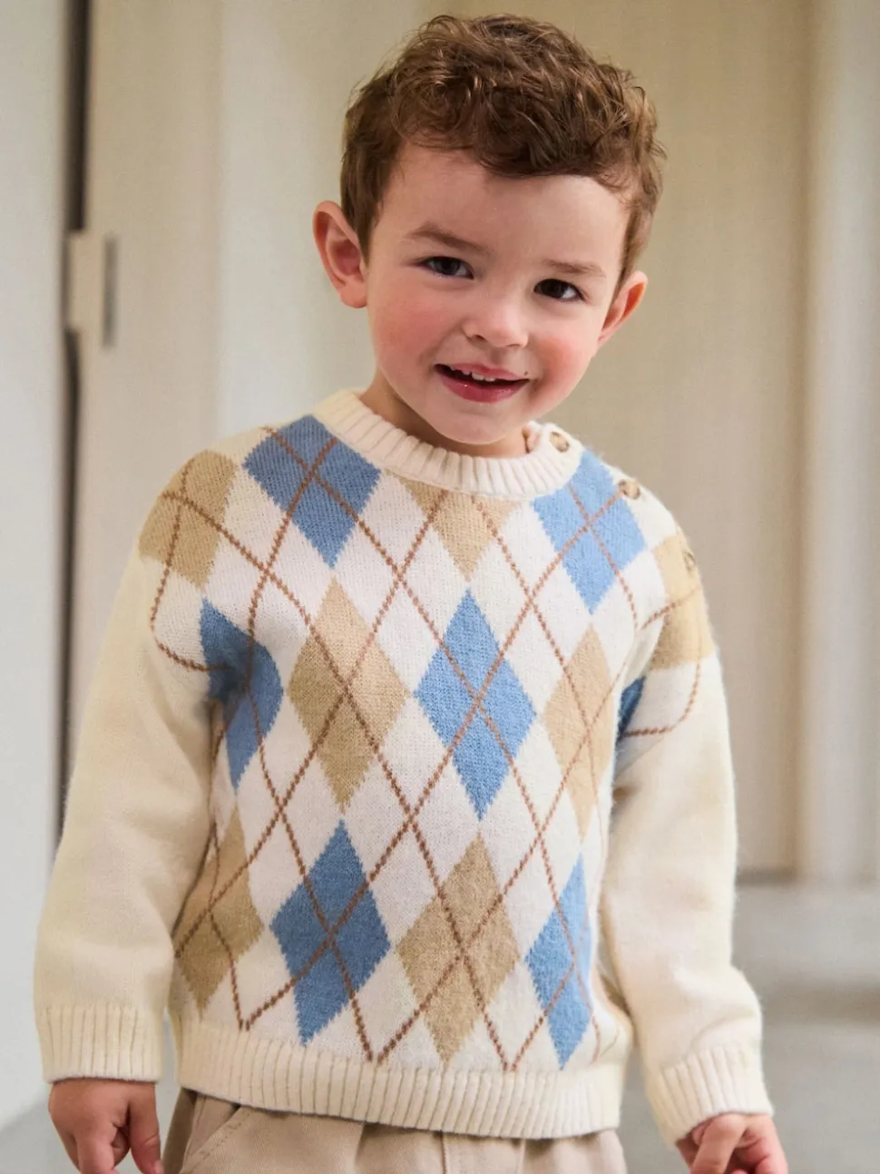Crème Argyle – Pull en coton à col rond en maille (3mois -7ans)