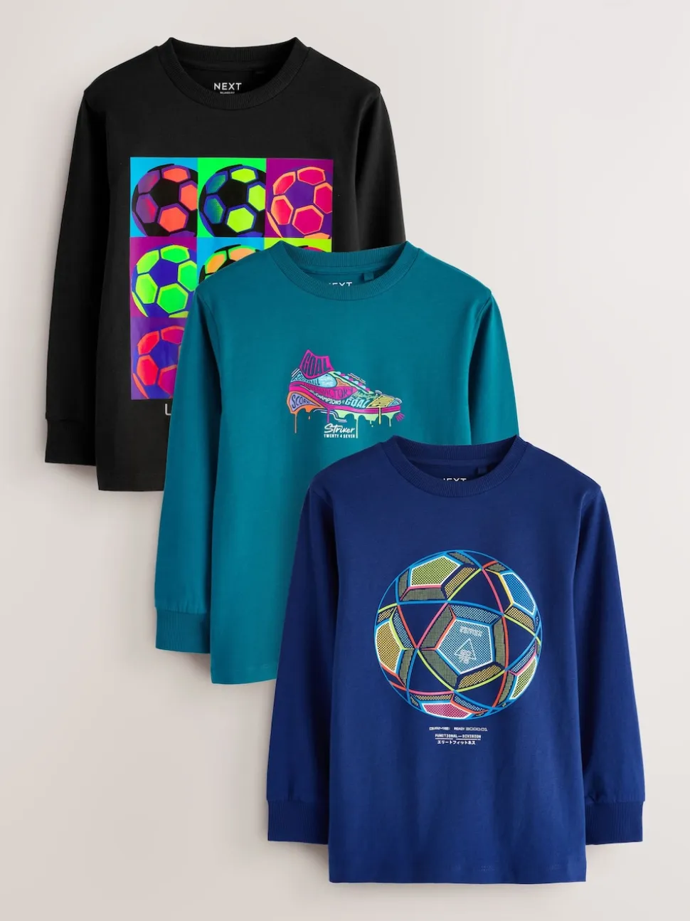 Football Bleu/Bleu canard/Noir – Lot de 3 T-shirts à manches longues coupe décontractée avec imprimé graphique (3-16ans)