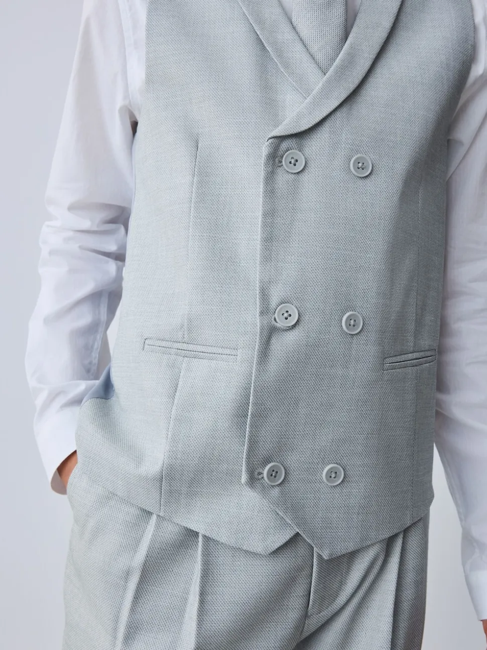 Shirt 100% Cotton. Waistcoat Main 85% Polyester, 13% Viscose, 2% Elastane. Back 100% Polyester. Lining 100% Polyester. Tie 85% Polyester, 13% Viscose, 2% Elastane.