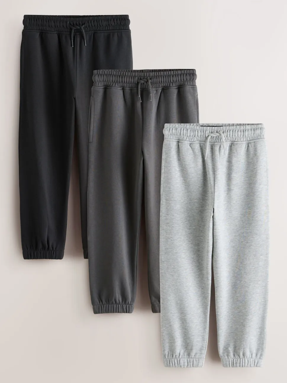 Lavable en machine. Joggings noir et Joggings ASPHALTE 80 % coton, 20 % polyester recyclé. Jogging GRIS CHINÉ 70 % coton, 22 % polyester recyclé, 8 % viscose.